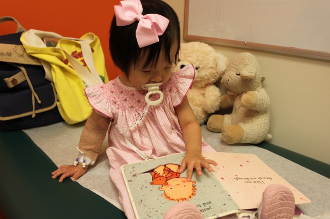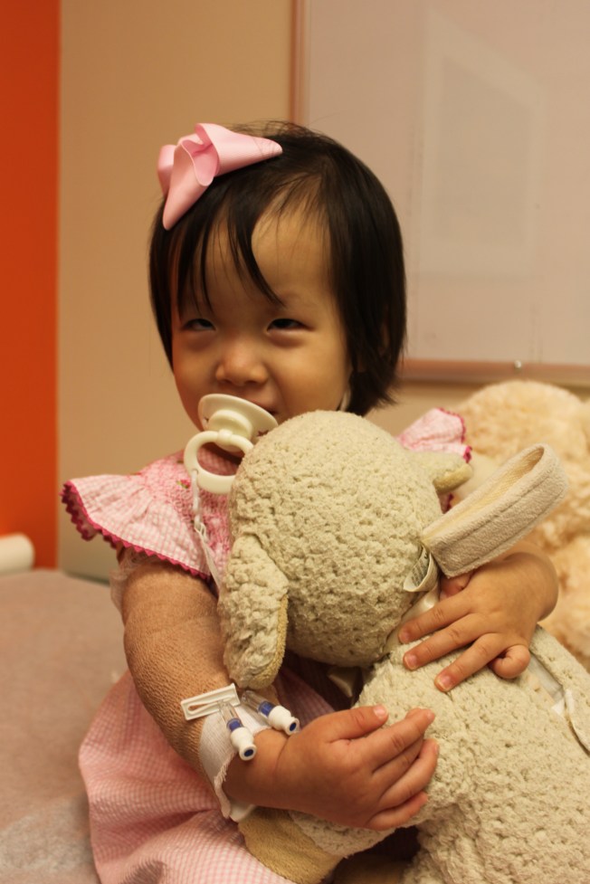 Below, Lily Love is at the doctor’s office taking everything in stride — even a 3+ hour test with an IV board on her arm. She cried hard when they inserted the IV and gave her a shot, thus the pacifier — Lily calls it a “gonkgong.” The wrap on her arm was in place to keep her from tugging on the IV.