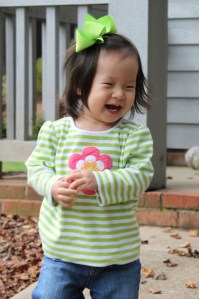 On these occasions, I grab her hand and we’ll run around the inside of the house a few times. A happy hum always emanates from her mouth as we run. [For some reason, I always tire of this game before she does.]
