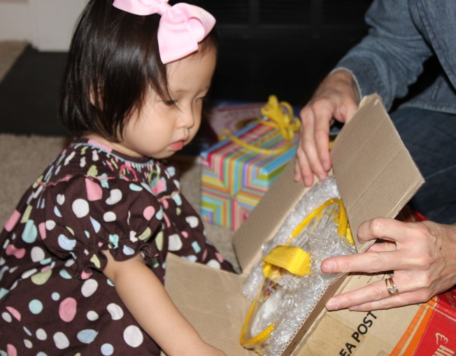 Three days before our girl’s 2nd birthday the postman arrived with a special delivery from Korea! We could hardly wait to see what the box with the telltale red characters contained, but we were pretty sure it was full of sweet birthday wishes…
